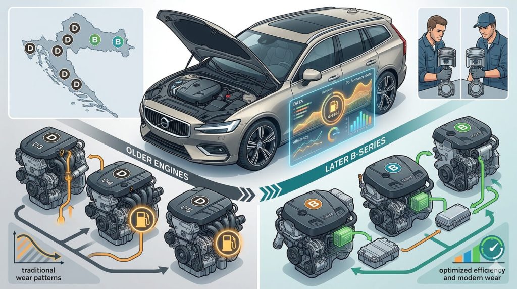 Volvo je kroz godine nudio raznorodne motore u V60, pa je za potencijalnog kupca rabljenog primjerka ključno razumjeti što se nalazi pod haubom prije nego ikakvu odluku donese. Stariji D oznaka (D3, D4, D5) i kasnija B serija razlikuju se u konstrukciji, tehnologiji i obrascima trošenja.