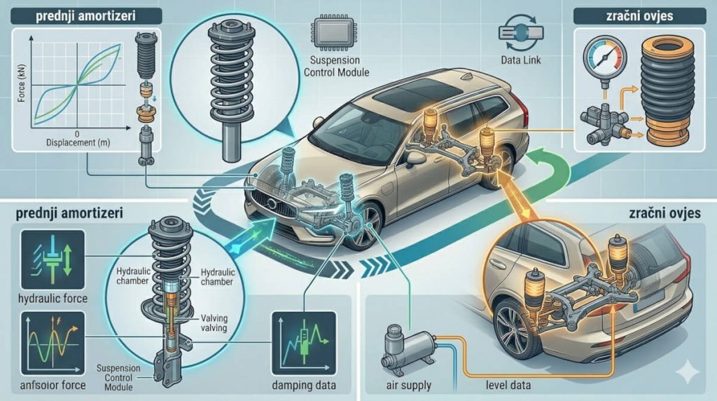 Zračni ovjes dostupan je kao opcija na višim razinama opreme i u praksi transformira udobnost vožnje. Nažalost, to je i najskuplja komponenta za popravak kada zakaže — zamjena jednog zračnog elementa u ovlaštenom Volvo servisu kreće se između 850 i 1.400 €, a kompresor dodatnih 600–900 €. Kod rabljenih primjeraka s više od 120.000 km obavezno na dizalici provjerite: je li auto u miru u pravilnoj razini, čuje li se rad kompresora duže od 30 sekundi po paljenju (znak gubitka tlaka), postoji li vidljivo oštećenje zračnih jastuka na sva četiri kotača. Kod primjeraka bez zračnog ovjesa, prednji amortizeri tipično traže zamjenu između 90.000 i 120.000 km, posebno ako su ugrađeni 19 ili 20-inčni kotači. Zamjena para u ovlaštenom servisu košta 780–1.100 €, neovisni majstori specijalizirani za Volvo spuštaju cijenu za 25–30 posto.