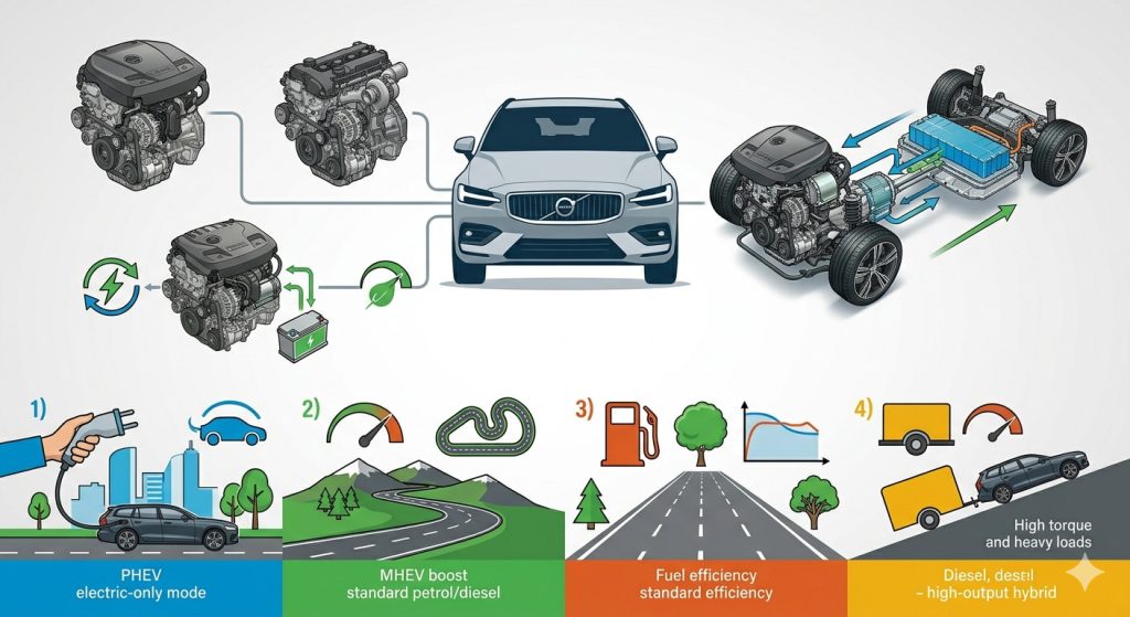 Volvo je prije nekoliko godina ukinuo stare D i T oznake te uveo B seriju — sve četverocilindraše od 2.0 litre s 48V mild-hybrid sustavom integriranim u pogonski sklop. Sve verzije sparene su s Aisin osmostupanjskim automatikom, koji radi uglađeno i predvidljivo, uz povremeno oklijevanje pri naglom pritisku papučice gasa u urbanom ritmu.